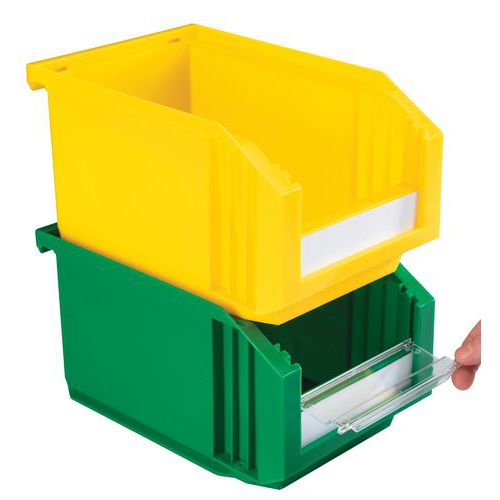 - Einsetzbare Blende, auch bei gestapelten Lagerkästen bedienbar.