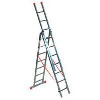Transformierbare Leiter mit Stabilisatorstrebe aus Aluminium. Sicherheitshaken aus Stahl an den Holmen befestigt. Hohe Sicherheit: Anti-Rutsch-Verriegelung. Die sehr robusten Gelenke aus Aluminiumguss sind mittels Schrauben an den Holmen befestigt.