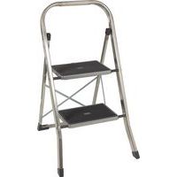Trittleiter aus Aluminium. Bequeme 82 mm Tiefe Stufen, parallele Holme für optimale Kniefreiheit Spezialplattform aus Stahl mit 50 rutschfesten Rippen, Tragkraft 265 kg/2600 N Die Stufen sind mit selbststanzenden Nieten an den Pfosten befestigt.