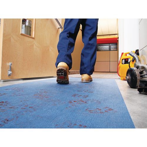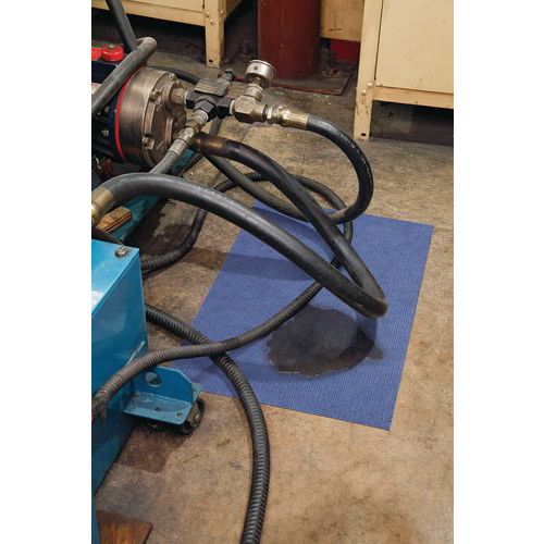 Absorptionsmatte mit selbstklebender Rückseite zur festen aber umsetzbaren Anhaftung am Boden. Absorbiert Öle, Wasser, Kühlflüssigkeiten und Lösungsmittel. Geeignet für intensives Begehen, sowie für Überrollen durch Fahrzeuge. Ideale in aree ad alto rischio di caduta o inciampo