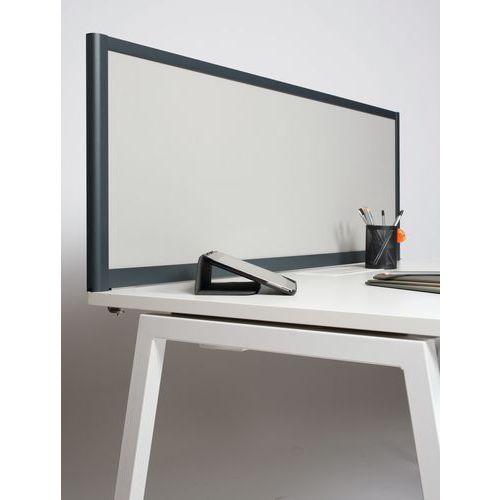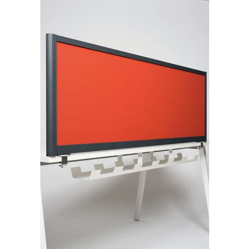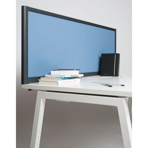 Abteilungsschirm für den Komfort Ihrer Mitarbeiter. Schützt Ihren Arbeits- und Kommunikationsbereich. Solider Aluminiumrahmen und mit farbigem Stoff beschichtete Spanplatte. Befestigung mit Klammern oder Aufstellung auf Füßen.