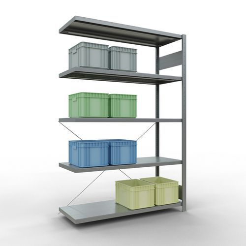 Robustes Lagerregal mit verzinkter Oberfläche, extrem witterungsbeständig in feuchten Umgebungen Auf den durchgehenden Stahlfachböden können Waren in vielen unterschiedlichen Größen gelagert werden Einfach und schnell durch Ineinanderstecken aufzubauendes Industrieregal, kein spezielles Werkzeug erforderlich Einfach erweiterbar mit einem oder mehreren Anbauelementen Lochabstand: 25 mm, Höhe des ersten Perforationslochs: 50 mm Höhe des ersten Perforationslochs: 22,5 mm