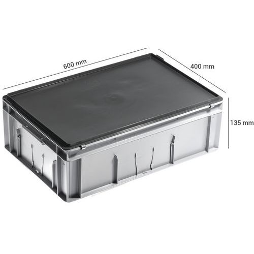 Stapelbarer Euronorm-Behälter mit Deckel. Mit Scharnierdeckel mit Verstärkungen sowie zwei Federverschlüssen. Zwei Etikettenhalter auf 2 Seiten (1 auf der langen Vorderseite des Behälters und 1 auf der kurzen Seite).