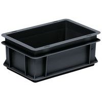 Stapelbarer Euronorm-Behälter aus leitendem Material mit geschlossenen Wänden, einem geschlossenen oder kompakten Boden und zwei Griffen oder Griffleisten.