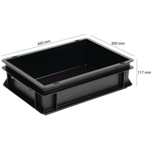 Stapelbarer Euronorm-Behälter aus leitendem Material mit geschlossenen Wänden, einem geschlossenen oder kompakten Boden und zwei Griffen oder Griffleisten.