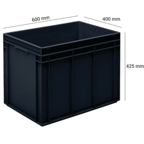 Stapelbarer Euronorm-Behälter aus leitendem Material mit geschlossenen Wänden, einem geschlossenen oder kompakten Boden und zwei Griffen oder Griffleisten.