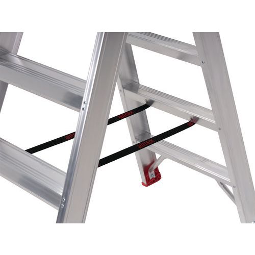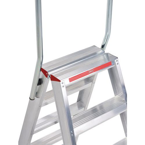 Beidseitig begehbare Stufenleiter für den professionellen Einsatz aus extrem leichtem Aluminium mit offenem Stufenprofil. Die Stufen sind mit Hohlnieten befestigt. Dadurch lassen sie sich bei Bedarf schnell austauschen. Garantierte Sicherheit dank rutschfestem Profil und Scharniersystem, das dem Einklemmen der Finger vorbeugt.