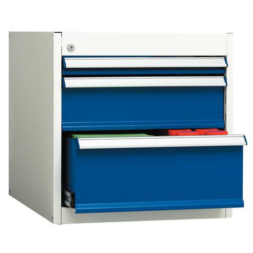 Schubladen- oder Türcontainer zur einfachen Montage am Arbeitsplatz. Schubladen mit zu 100 % ausziehbaren Teleskopschienen. Maximale Sicherheit durch Zentralverriegelung. Schubladen- und Türblock mit Alugriffen und Etikettenträgern. Kundengarantie : 3 Jahre