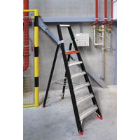 Sichere Trittleiter mit automatisch verriegelndem Scharnier. Äußerst standsicher dank Ständern an der hinteren Strebe. Praktische Trittleiter mit Werkzeugträger.