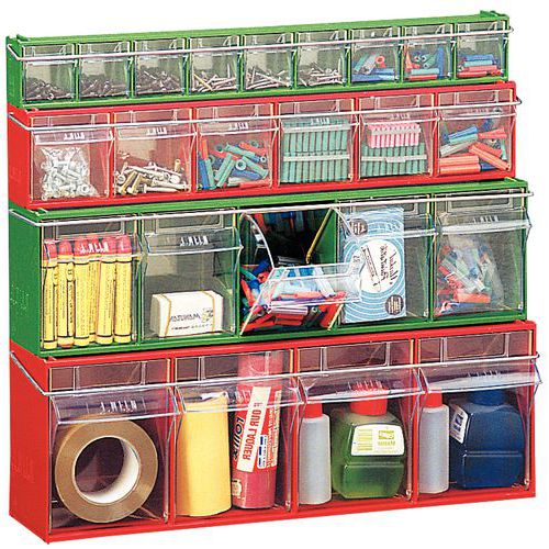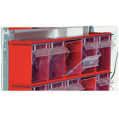 Für die Aufbewahrung kleinerer Teile. Mit herausnehmbaren und durchsichtigen Kippbehältern. Einschubblöcke einfach durch Aneinanderklipsen kombinierbar. Bitte separat eine Sicherheitsstange bestellen, damit die Behälter nicht herunterfallen können.