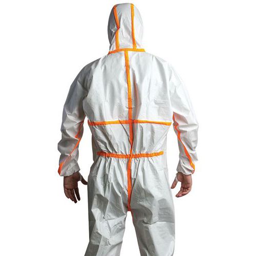 Tuta antistatica senza silicone. Realizzato con film microporosi laminati. Cappuccio elasticizzato a 3 pannelli. Sottogola.