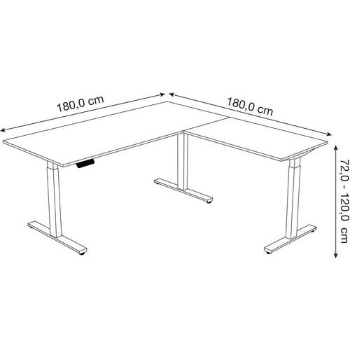 Elektrischer Schreibtisch in L-Form rechts. 19 mm starke, melaminbeschichtete Platte. T-Untergestell. Höhe von 72 cm bis 120 cm einstellbar.