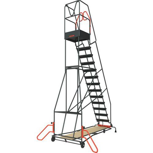 Rollbare Regaltrittleiter mit automatischer Feststellung für mehr Sicherheit und eine optimale Ergonomie Aus maschinengeschweißtem Stahl mit rutschfesten selbsttragenden Stufen und oberer Platte aus verstärktem, rutschfestem Blech Hohe Sicherheit für den Benutzer mit einer Sperre des Rahmens der oberen Platte, die in nur eine Richtung geöffnet werden kann Große Platte auf der unteren Ebene aus widerstandsfähig lackiertem Holz, verwendbar als Stauraum Optimale Stabilität: schwenkbare Stabilisatoren und geschweißte Handläufe auf jeder Seite
