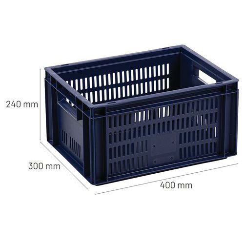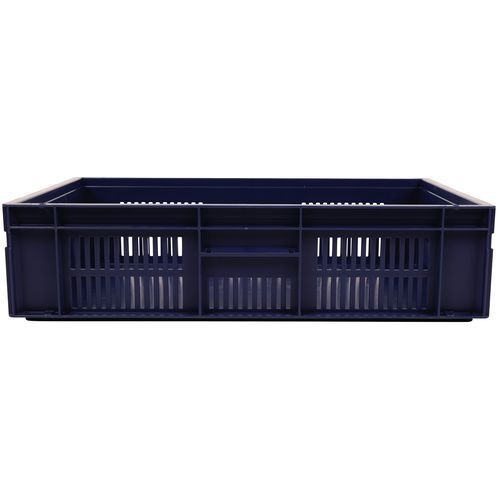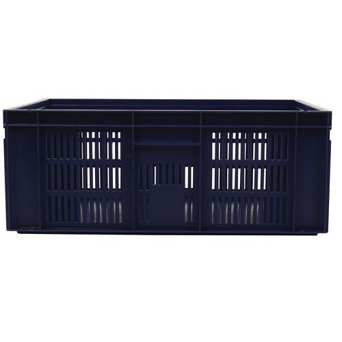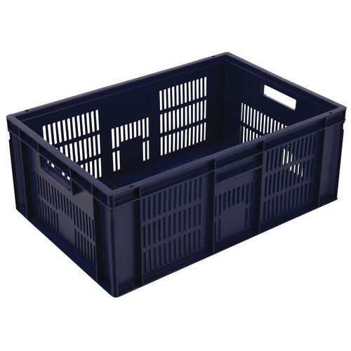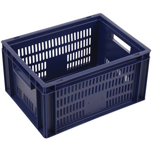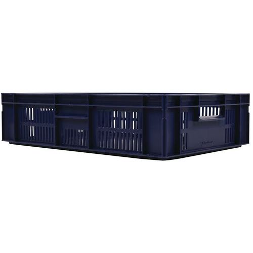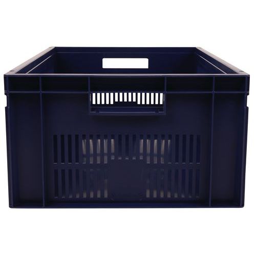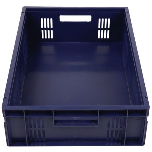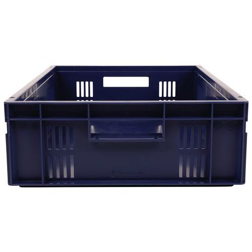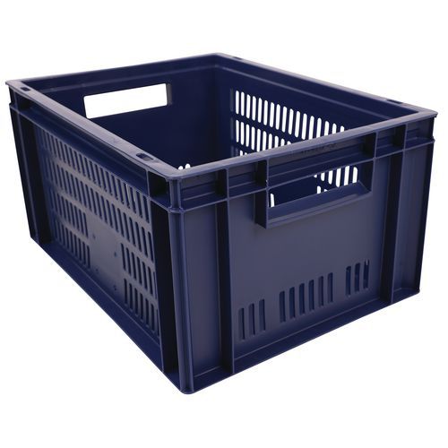 Blauer Euronormbehälter, hohe Stabilität beim Stapeln Garantiert gute Belüftung dank durchbrochener Wände Einfache Handhabung dank großen Grifföffnungen Beständig gegen Öle, Fette und zahlreiche Chemikalien
