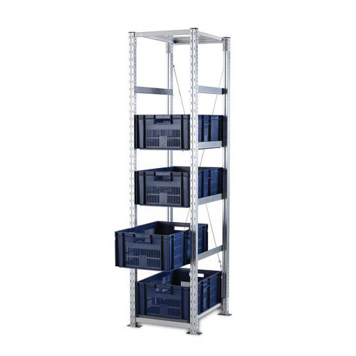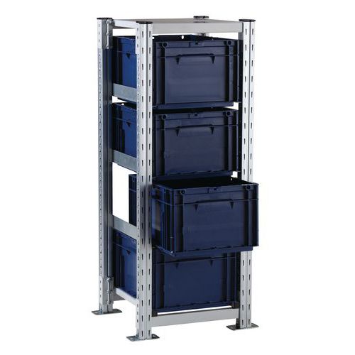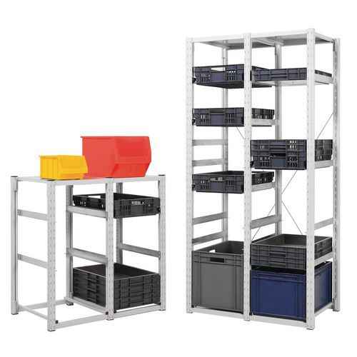 Spezialregal für Euronorm-Behälter, 400 x 300 mm und 600 x 400 mm Geeignet für Euronorm-Behälter mit einer maximalen Höhe von 230 mm Einfache Montage und Erweiterung mit Anschlussmodulen Kreuzverbände nicht enthalten Trasforma i tuoi contenitori per il trasporto in contenitori per lo stoccaggio!