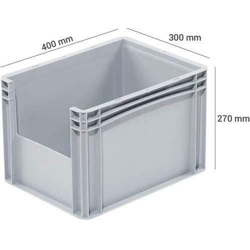 | Produktname | Euronormbehälter mit Frontöffnung - Länge 400 mm - 21 L, Gesamtinhalt: 26 L, Stapelbar: ja |