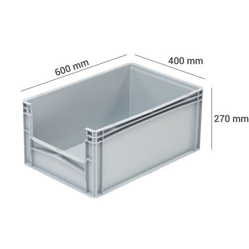 | Produktname | Euronormbehälter mit Frontöffnung - Länge 600 mm - 44 bis 64 L, Gesamtinhalt: 54 L, Stapelbar: ja |