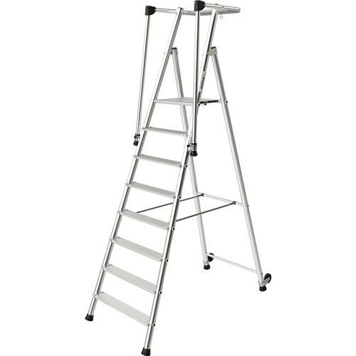 Trittleiter aus Aluminium, extrem sicher, für eine sehr intensive Nutzung. Große, rutschfeste Plattform mit Geländer an 3 Seiten. Trittleiter mit integrierter, doppelter Rampe, einklappbar. Endstücke aus Spritzguss-Aluminiumteilen, Verdrehsicherung. Breite Stufe mit Kante, rutschfest. Zoccoli antiscivolo molto avvolgenti. Facile spostamento grazie a 2 ruote. Prodotto fabbricato in Francia. Kundengarantie : 5 Jahre Max. Belastung (kg) : 150