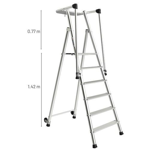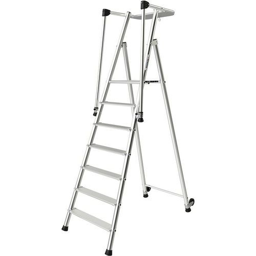 Trittleiter aus Aluminium, extrem sicher, für eine sehr intensive Nutzung. Große, rutschfeste Plattform mit Geländer an 3 Seiten. Trittleiter mit integrierter, doppelter Rampe, einklappbar. Endstücke aus Spritzguss-Aluminiumteilen, Verdrehsicherung. Breite Stufe mit Kante, rutschfest. Zoccoli antiscivolo molto avvolgenti. Facile spostamento grazie a 2 ruote. Prodotto fabbricato in Francia. Kundengarantie : 5 Jahre Max. Belastung (kg) : 150 kg
