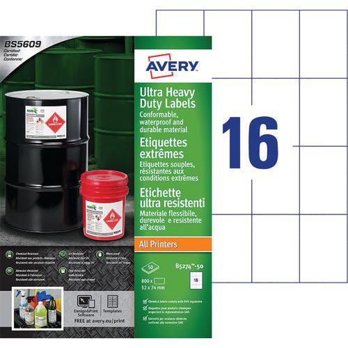 Zertifiziert nach BS-5609, Sektion 2 (Widerstandsfähigkeit des Etiketts und des Klebstoffes) und für die Etikettierung von gefährlichen, chemischen Produkten geeignet.