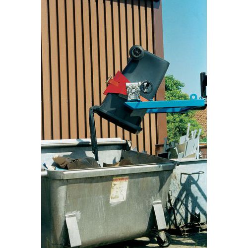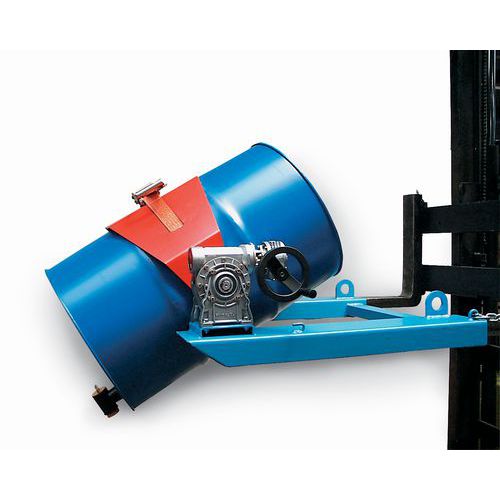 Zum Transportieren, dosierten Kippen, Wenden und Ablegen von Stahl- oder Kunststofffässern mit 60 bis 220 l Inhalt. Auch für 120- bis 240-l-Müllbehälter geeignet. Stabiler Grundrahmen mit Einfahrtaschen (15 x 6 cm) zum Aufnehmen mit dem Gabelstapler, Radlader und Zugwinde. Drehen um 360°. Sicheres Verriegeln des Fasses mit Spanngurt und Doppelschneckengetriebe zum kontrollierten Entleeren des Fasses.