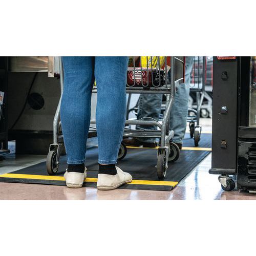 Biegsame Matte aus PVC mit versetzten gelben Streifen zur Einhaltung der Social-Distancing-Abstände. Hervorragende Schalldämpfung, bequemer Stand, überdeckt Unebenheiten im Boden Hergestellt aus porenfreiem PVC-Material, welches eine natürliche Resistenz gegen Bakterien bietet Struktur aus zwei überkreuzten Lagen mit offenem PVC-Gitter zum schnellen Trocknen von Flüssigkeiten. Kinderleichte Reinigung: Matte anheben oder einrollen und mit einem Hochdruckschlauch reinigen. Assicurati comodamente che le distanze di sicurezza siano rispettate dai tuoi visitatori, clienti, dipendenti