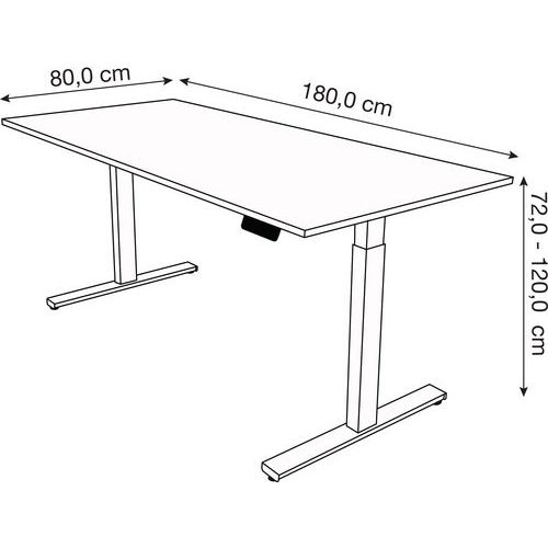 Höhe von 72 cm bis 120 cm einstellbar. Melaminbeschichtete Platte, ABS, 19 mm. Stahlstruktur und Fuß in T-Form. Memory-Funktion: 4 Höhenvoreinstellungen für einfache Verstellung. Einstellgeschwindigkeit von 36 mm/Sekunde.