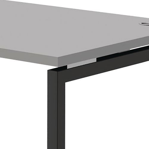 Tischbeine mit Epoxidbeschichtung sind stoßfest. Die Melaminarbeitsplatte und die stoßfeste ABS-Kante sorgen für große Langlebigkeit. Durchführung der Kabel unter der Arbeitsplatte des Schreibtischs.