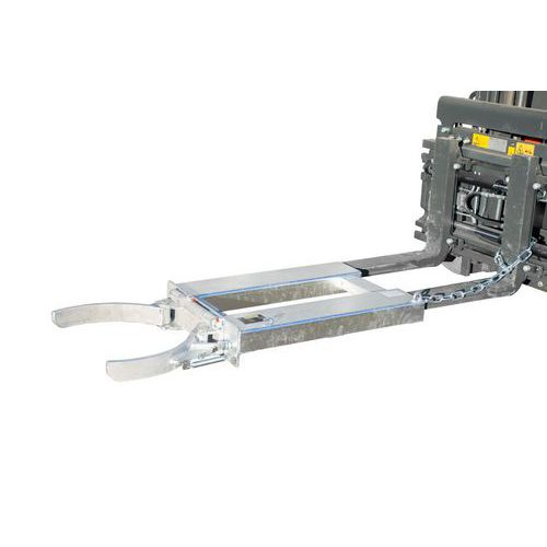 Greifer für Fässer: zum Transportieren von Fässern auf Rollen und mit Rillen mittels Hubwagen. Beim Absetzen des Fasses öffnet sich der Greifer automatisch. Gegen versehentliches Abrutschen gesichert.