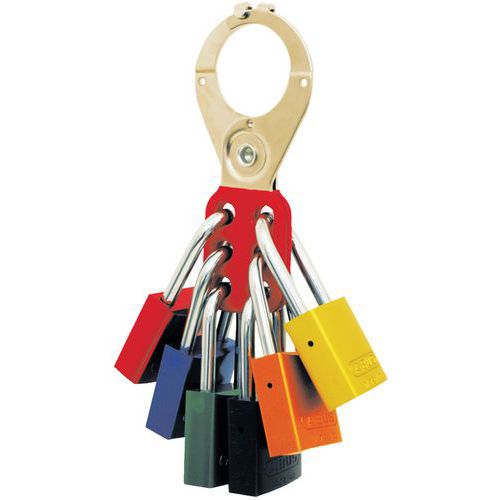 Klammer zur einfachen Verriegelung der Hauptenergiequelle bei der Maschinenwartung. Versehentlicher Wiederanlauf wird somit verhindert. Der Rumpf kann bis zu 6 Vorhängeschlösser aufnehmen. Zusätzliche Sicherung an der Backe.