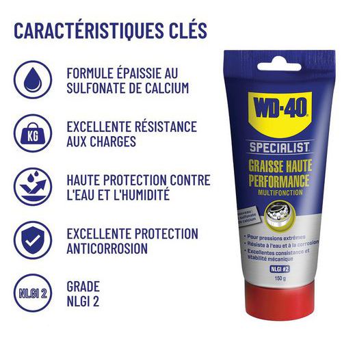 Hochleistungsfähiges Mehrzweck-Schmiermittel WD-40 Specialist für extreme Belastung Wasser-, feuchtigkeits- und korrosionsbeständig Verfügt über eine hervorragende Konsistenz und mechanische Stabilität Dickflüssige Formel mit Calciumsulfonat
