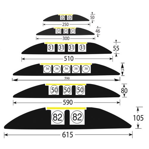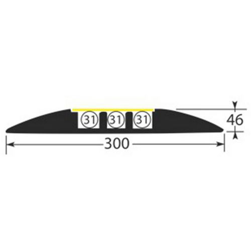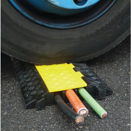 Kabelbrücke Cobra mit mehreren Kanälen für Fahrzeugüberfahrt. Schwarze Elastomerbasis und gelbe Abdeckung mit Scharnier Für die Überfahrt von Fahrzeugen mit 44 Tonnen geeignet. Schwarze Elastomerbasis und gelbe Abdeckung mit Scharnier. Montage mit Schwalbenschwanzsystem. Prodotto testato presso rapporto LNE n°P145630 (Laboratorio Nazionale Prove). Max. Belastung (kg) : 44000 kg