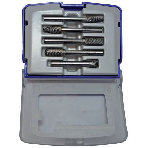 | Produktname | Koffer: Hartmetallfrässtifte Ø 8 mm Rechtsgewinde, Stückzahl: 5, Werkstoff: Stahl, Typ Stütz: Kunststoff |