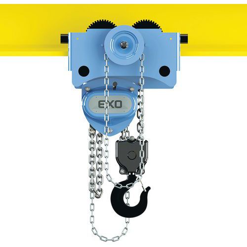 Kombi Kettenzug/Laufkatze mit elektroverzinkter Bedienkette mit Korrosionsschutz. Solide und hochfeste Lackierung und unlackierte Teile mit Korrosionsschutz. Die Lastkette (Grad 80) ist mit einem Lasthaken mit Sicherung ausgestattet. Kettenzug/Laufkatze kompatibel mit Trägern vom Typ IPE, IPN, HEA und HEB. Hergestellt in Frankreich CE Max. Belastung (kg) : 20000