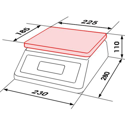 Waage mit zwei Anzeigen: Vorne und hinten. Funktionen: Wiegen, Tarieren Stückpreiskalkulation. Einheiten: g, kg, lb. Automatische Abschaltung der Anzeige regelbar. Aufladbarer Akku (Betriebsdauer von bis zu 40 Std.). Alimentazione di rete. Regolazione sistematica del dispositivo in base al luogo di consegna.