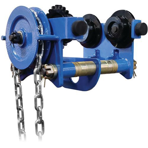 Kranlaufkatze mit Anti-Kipp-Funktion und elektroverzinkter Bedienkette mit Korrosionsschutz. Solide und hochfeste Lackierung, unlackierte Teile mit Korrosionsschutz. Mit Gummi-Endanschlägen und Rollen aus geschmiedetem Stahl. Kompatibel mit Trägern vom Typ IPE, IPN, HEA und HEB.