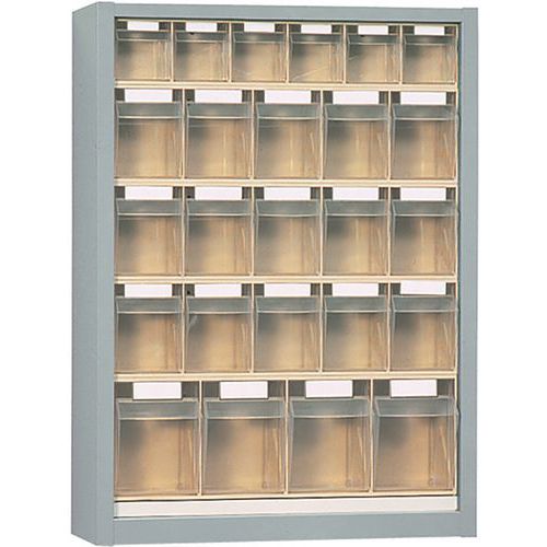 Lagerschrank für organisierte, vor Staub geschützte Aufbewahrung von Artikeln. Einfaches Herausnehmen der durchsichtigen Kippbehälter aus dem Stahlschrank. Die sehr festen Kippbehälter sind öl- und kraftstoffbeständig. Mit Griffen und Etikettenhaltern. Einfach mehrere Lagerschränke stapeln oder aufhängen. Max. Belastung (kg) : 29 Kundengarantie : 3 Jahre