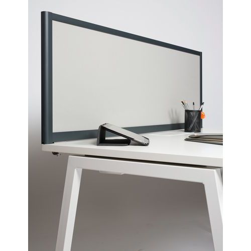 Lärmschutzwand für das Büro: für guten Schallschutz. Solider Aluminiumrahmen und mit farbigem Stoff beschichtete Spanplatte. Schallisolierend bei angenehmem Sichtkomfort. Befestigung mit Klammern oder Aufstellung auf Füßen.