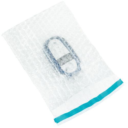 Beutel aus dreilagiger Luftpolsterfolie mit Klebestreifen zum Umfalten. Flexibel, passt sich perfekt an die Form des Produkts an. Die beiden glatten Oberflächen erleichtern das Eintüten.