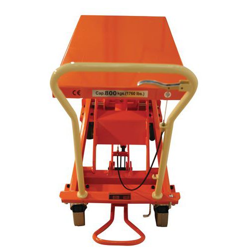 Handlicher Hubtisch mit Rollen mit geringem Anlaufwiderstand. Hochwertige Hydraulikpumpe mit verchromtem Kolben. Präzises Leerlaufventil mit konstanter Senkgeschwindigkeit. Niedrige Bauhöhe. Wagen und Schere aus geschweißtem Profilstahl, strapazierfähig und wartungsfrei. Robuster Schiebebügel. Kundengarantie : 3 Jahre Max. Belastung (kg) : 800 kg