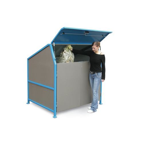 Mülltonnenbox mit Dach, drei Wänden und einer Doppel-Schwingtür.
