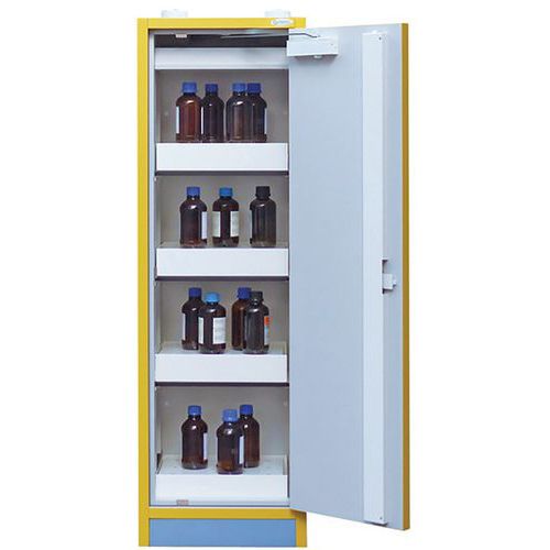 Multi-Sicherheitsschrank gemäß der Norm EN 14470-1. Mit einer Feuerfestigkeit von 30 Minuten. Fächereinteilung zur Lagerung von nicht miteinander kompatiblen chemischen Substanzen. Funkensichere 3-Punkt-Verriegelung mit Schlüssel. Lüftungsöffnungen für den Anschluss an eine Belüftung. Guarnizioni porta termodilatanti Piedini cilindrici per livellamento Condotti di ventilazione con sistema hot melt. Testato e approvato secondo lo standard FM 6050.