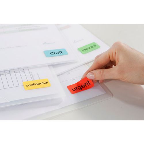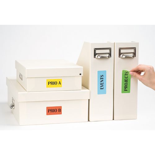 Vorgeschnittene farbige Etiketten für eindeutige und schnelle Erkennung. Spurlos ablösbar, kleben selbst nach mehreren Anwendungen noch perfekt. Mit allen Laser- bzw. Tintenstrahldruckern und Kopiergeräten kompatibel.