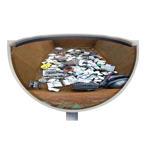 Überwachungsspiegel, Halbkugel mit einer 180°-Panorama-Sicht in 3 Richtungen. Ideal für Kontrolle und Überwachung von Parkplatzausfahrten. Maschinenführer können nach hinten und in den toten Winkel sehen. Reflektor aus Plexiglas, sehr robust, beständig und formstabil.