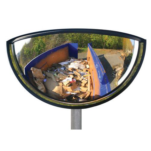 Überwachungsspiegel, Halbkugel mit einer 180°-Panorama-Sicht in 3 Richtungen. Ideal für Kontrolle und Überwachung von Parkplatzausfahrten. Maschinenführer können nach hinten und in den toten Winkel sehen. Reflektor aus Plexiglas, sehr robust, beständig und formstabil.