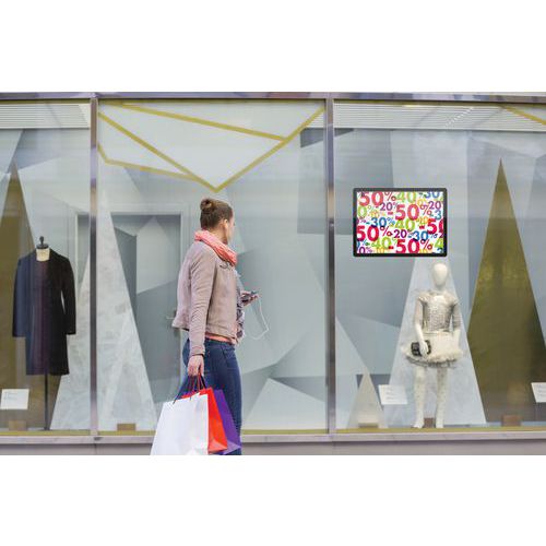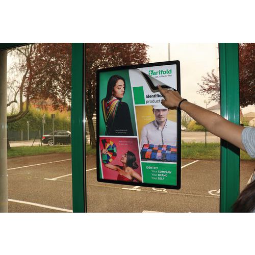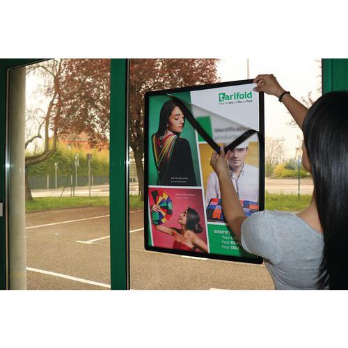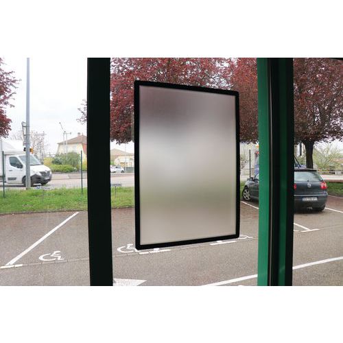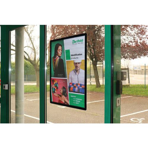 Doppelseitiges Aushängen an Glasscheiben dank beidseitigem Rahmen.