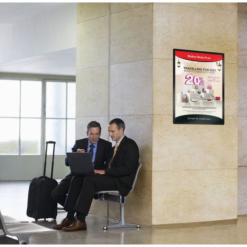 Doppelseitiges Aushängen an Glasscheiben dank beidseitigem Rahmen.