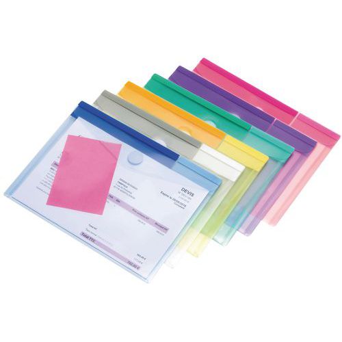 Praktische Mappe im DIN A4-Format mit Siebdruck-Design zur geschützten, geordneten Aufbewahrung oder Präsentation Ihrer Dokumente. Verschluss mittels klettverschluss® -Knopf für perfekten Halt. Aus starrem Polypropylen, glatt und glänzend. In topaktuellen, durchscheinenden Pastellfarben: blau, violett, grün, gelb, rosa, farblos.
