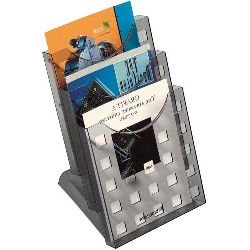 | Produktname | Prospekthalter A4 - 3 Fächer - Helit, Farbe: Grau, Gesamthöhe: 28.8 cm, Für Format: 210 x 297 mm (A4) |