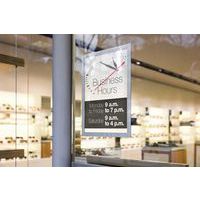 Rahmen zum Aushängen von Preislisten, Öffnungszeiten, Sonderangeboten usw. Informationsrahmen Duraframe® Sun, speziell für der Sonne ausgesetzte Glasflächen entwickelt Dank der Fixierung für Glasflächen kann der Rahmen auf Vitrinen, Fenstern, Glasflächen usw. angebracht werden. Dank des magnetischen Rahmens lassen sich Dokumente schnell einfügen und aktualisieren Hitzebeständig (bis zu 70 °C) und mit UV-Schutzfolie, die bis zu 2 Jahre wirksam ist